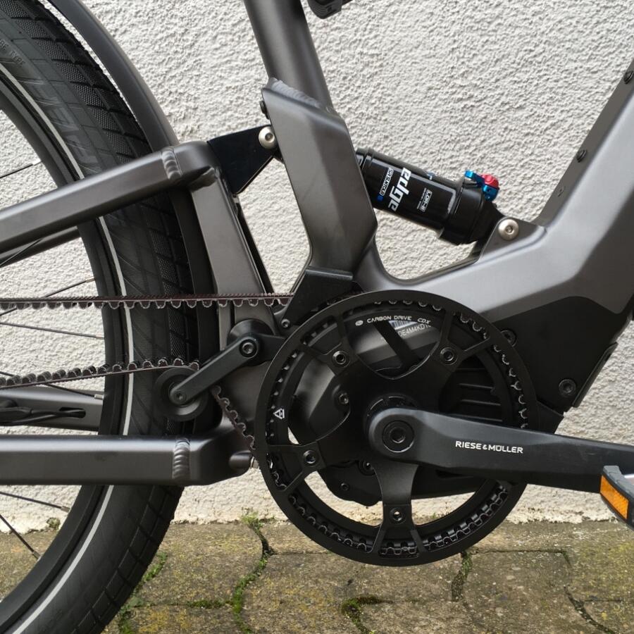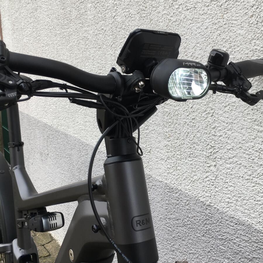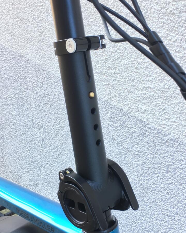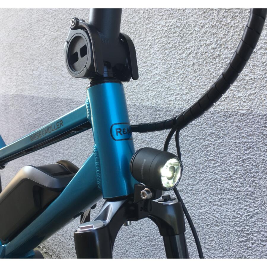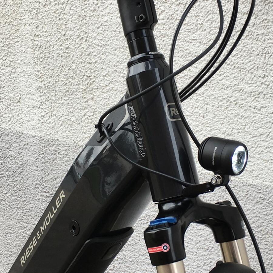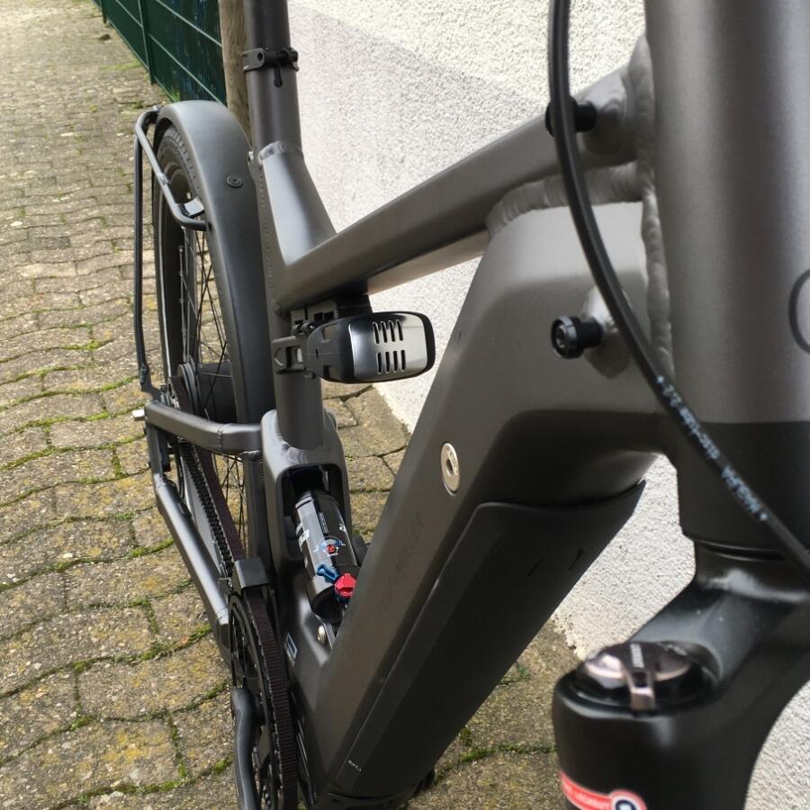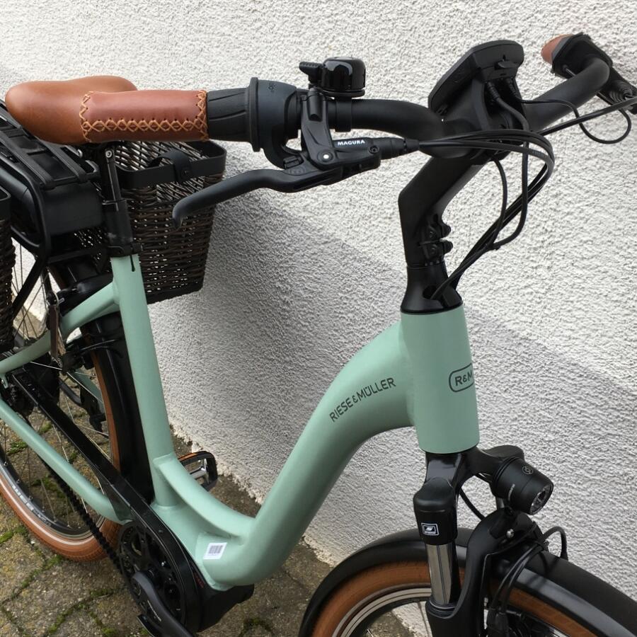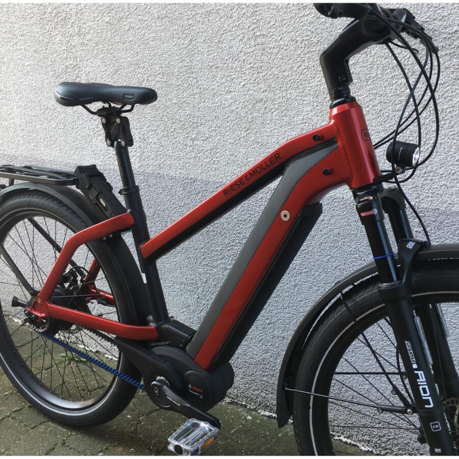 Als optionales Zubehör ist eine gepolsterte Sitzfläsche mit Haltegriffen an der Sattelstütze oder ein paar sehr große Packtaschen von riese & müller erhältlich.Das Trekkingrad von r&M mit Breitreifen in attraktiver Optik mit optionalem Bosch Kiox Display das im Vorbau integriert ist und per Magnet am Vorbau festgehalten wird.